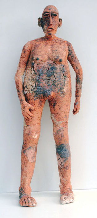 Roodbakkende klei gemengd met blauw glas, elektrisch gebakken 1060°C