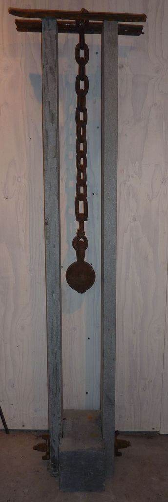 Twee zuilen van hardsteen en een hardstenen voet deze worden verbonden met twee grote vleugelmoeren In het midden hangt een zware metalen ketiing met metalen bal.