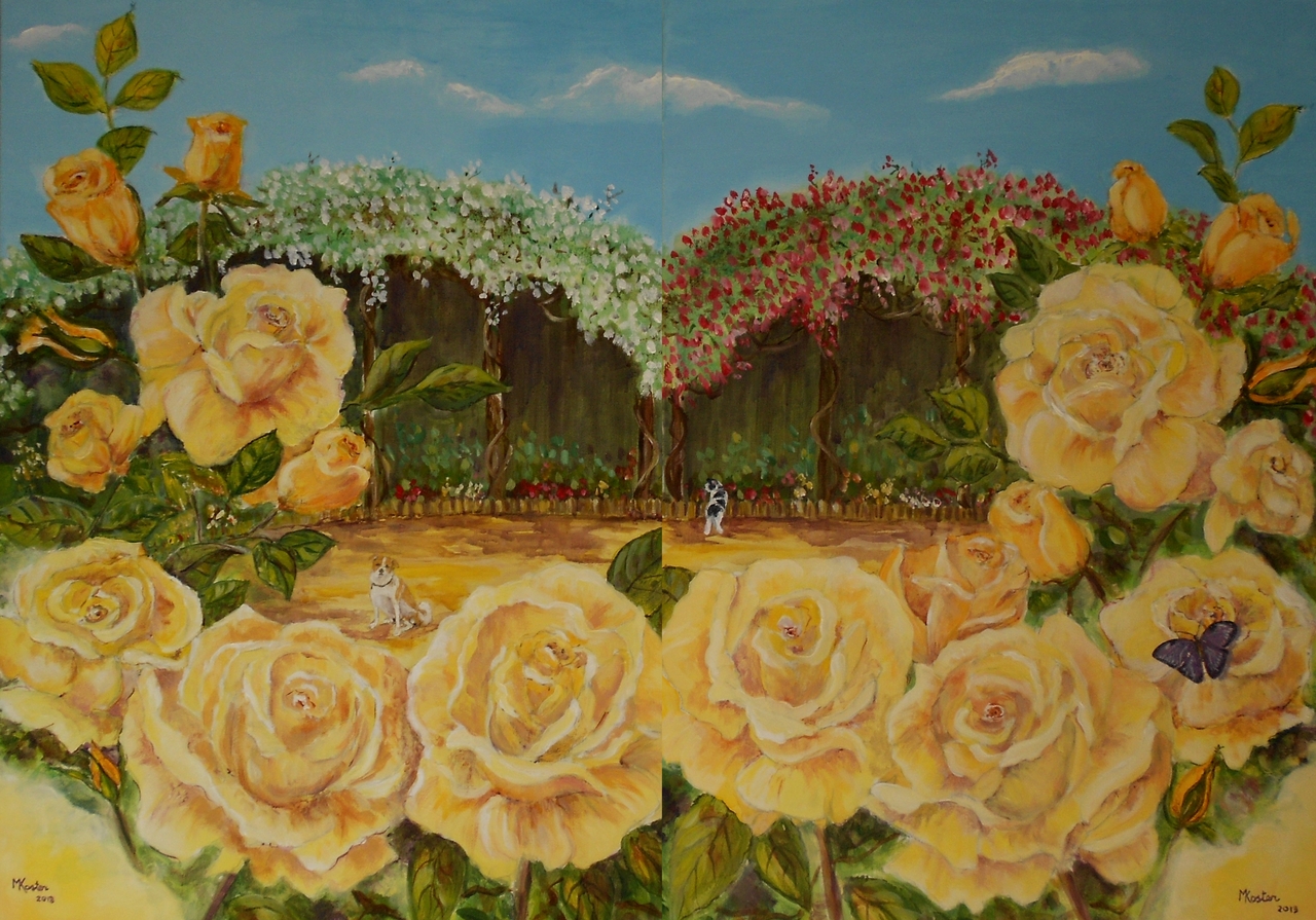 In opdracht gemaakt 2-luik. Na het overlijden van een dierbare is deze tuin van herinnering geschilderd. Met persoonlijke elementen in de kleuren van het licht (geel) en met de paarse (rouwkleur, maar ook de complementaire kleur van geel) vlinder in de tuin waar zij samen veel verbleven. De vlinder, het symbool van de ziel. De compositie loopt door en de schilderijen zijn afzonderlijk ook op te hangen.