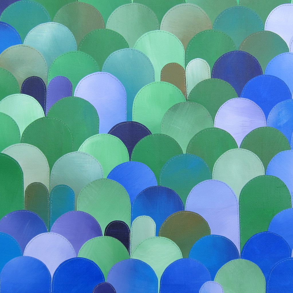 Compositie van aan elkaar genaaide stukjes beschilderd doek.
