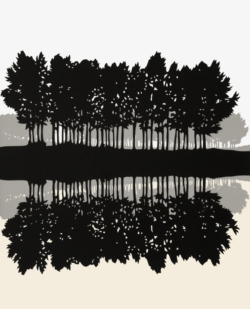 Reflecties in het landschap - een windstille ochtend - collage in gekleurd papier.