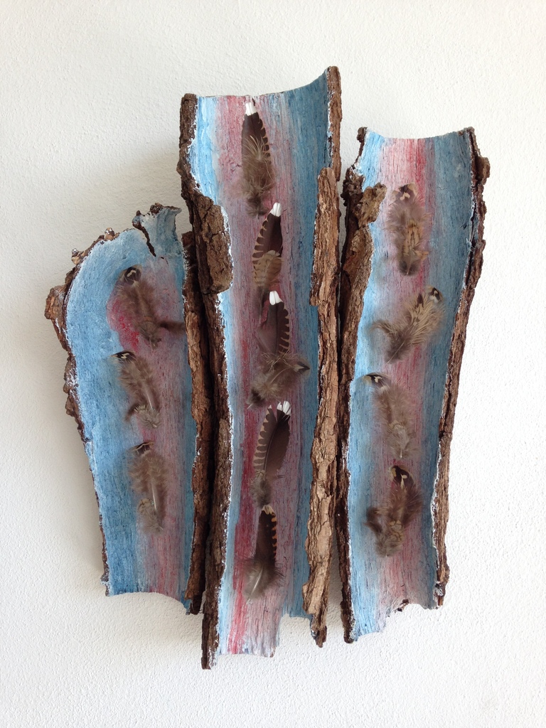 Drie Eiken verwijst naar een heilige plek in het bos. Een plek met spiritule kracht. De boomschors is van een jonge eik. Ik gebruikte voor het bauw natuurlijk indigo en de veertjes zijn van een watersnip. Ik hou van de grote tegenstelling tussen de robuste eik en de fragile veertjes van de watersnip.
