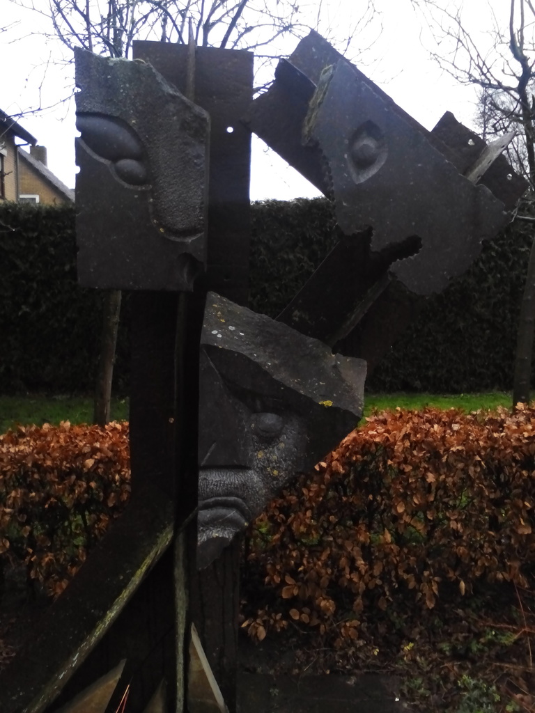 Gesprek . 3 hardsteen koppen , die in een driehoek worden gefixeerd door de constructie van oude stalen scheepshuid.