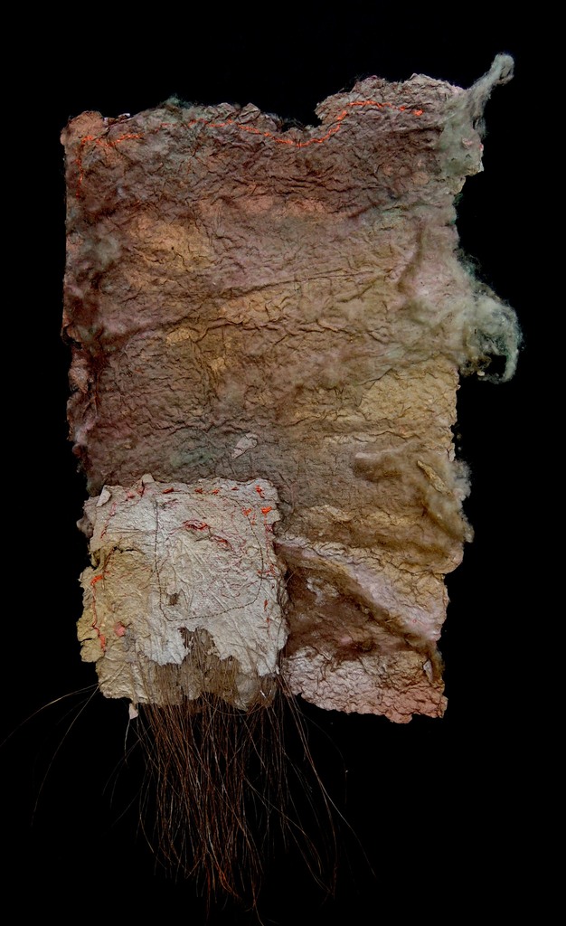 Handgeschept papier met kokosdraden en zijde, een historische bladzij.