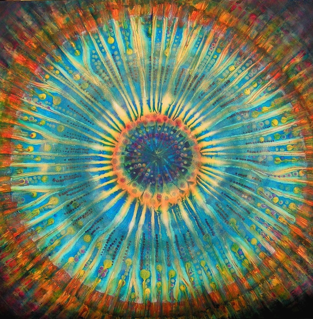 The eye in the sky Een beeld bij het horen van een cover van "I am an eye in the sky" (A. Parson) We kunnen ons zelf en anderen voorliegen, uiteindelijk is er een alles ziend oog. Acrylverf, zand op linnen.