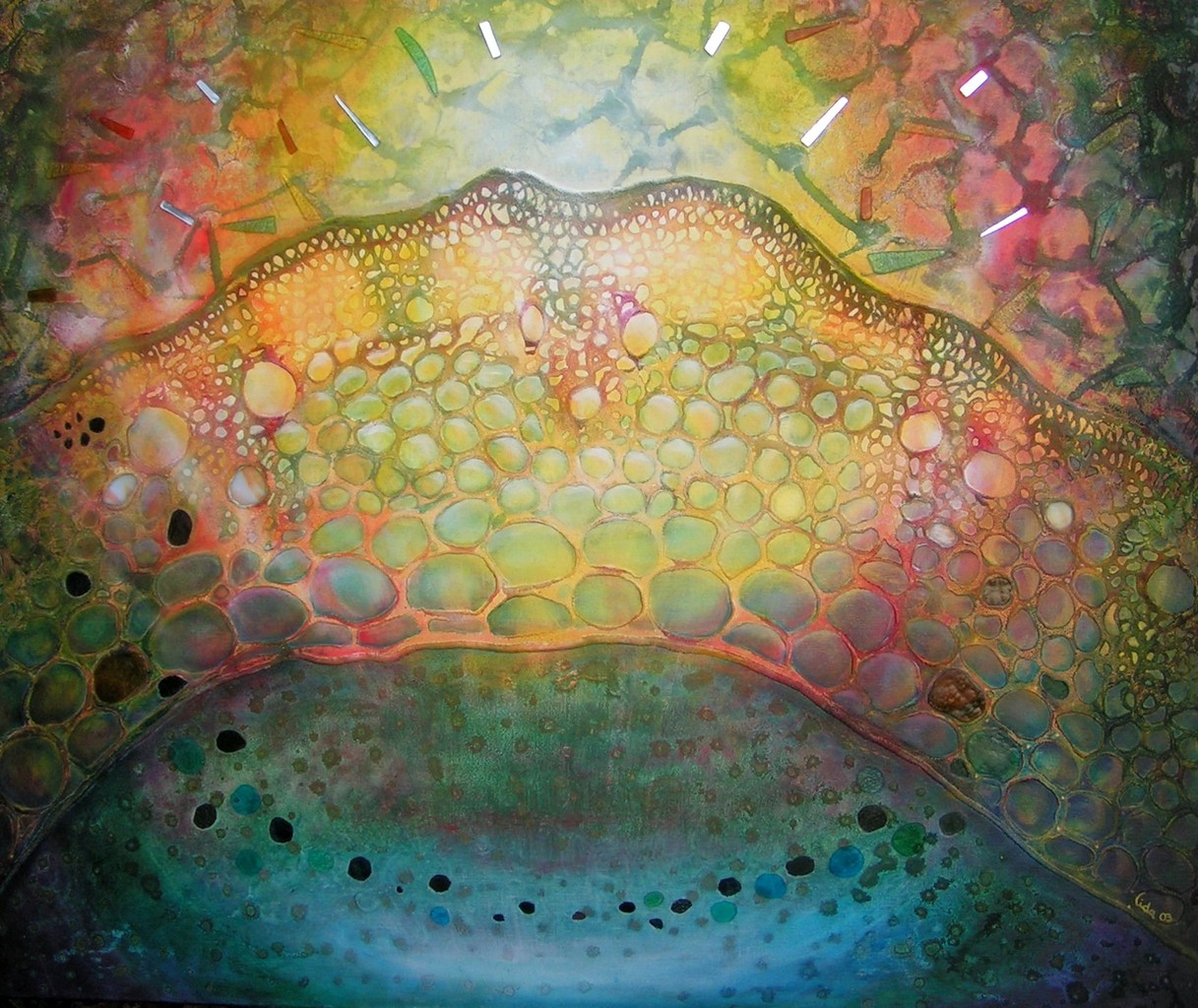 Zomerzin Het verlangen naar de zomer. De voorjaarszon op je huid voelen. De warmte, de kleuren, de geuren.... Acryl, zand en (spiegel)glas op linnen.