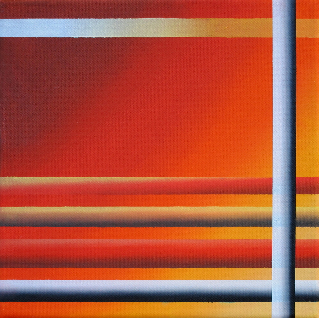 Geometrische compositie met oranje, rood, geel, wit, grijs en zwart. De zijkanten van het doek (katoen) zijn ook beschilderd.
