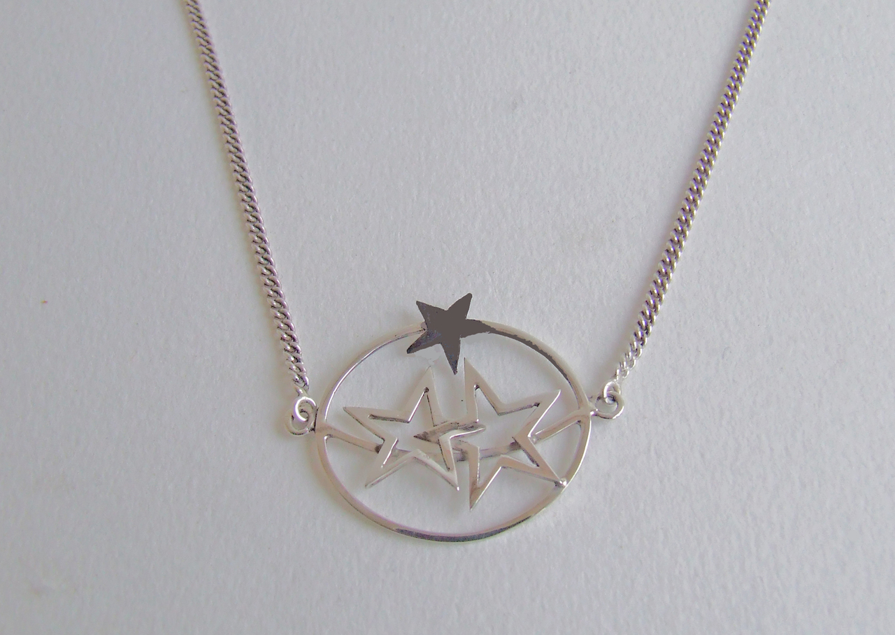 Zilveren hanger bestaande uit twee in elkaar gehaakte sterretjes, die op een gebogen draad zijn bevestigd. Dit is gemonteerd in een ovaal van draad. Aan de bovenzijde van het ovaal is een kleiner gezwart sterretje aangebracht. Het geheel is hoogglans gepolijst.(ontwerpopdracht S1177)