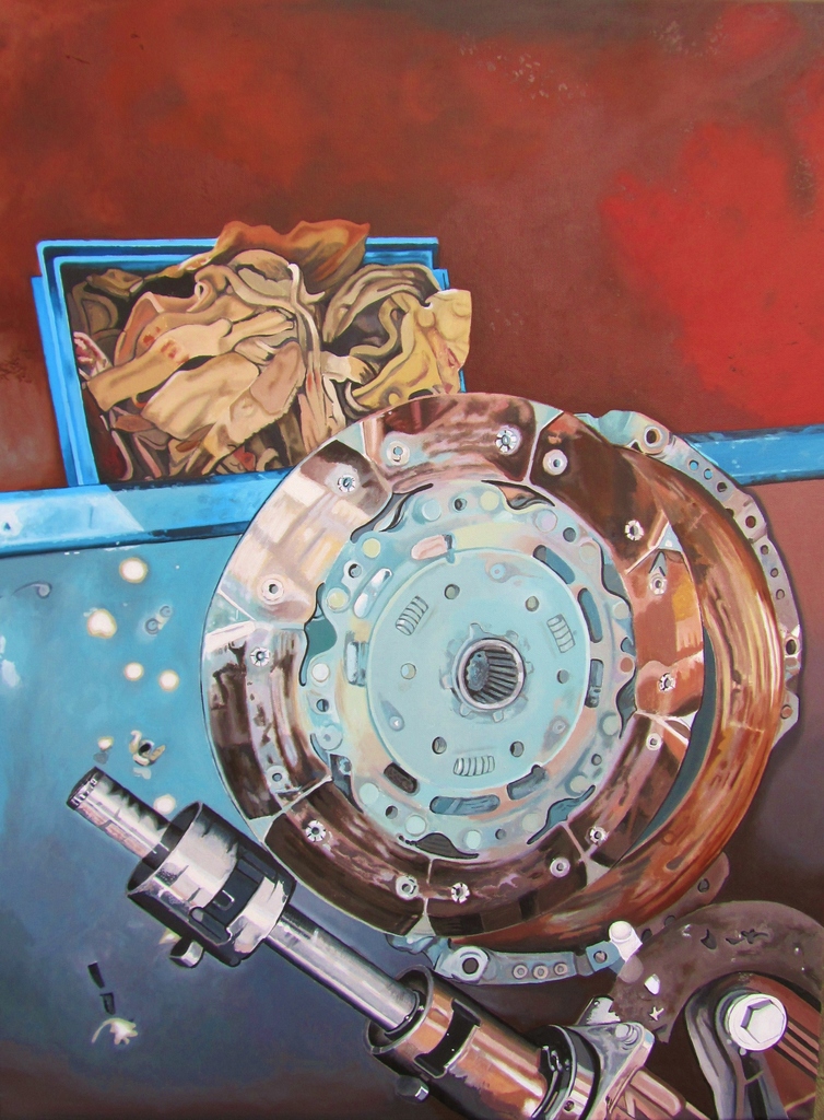 Rood Blauw Realistisch Olieverf Metaal Doeken Tafel Abstrakt Garage Glimmend Rotzooi Monteur Koppelingsplaat