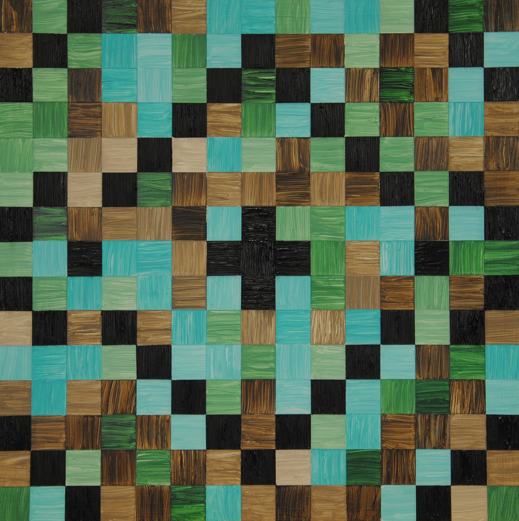 Thema: Chaos (Geometrische Chaos) Mijn kunst is beïnvloedt door de moderne wiskundige en wetenschappelijke benadering van het begrip complexe orde van de natuur. Met name heb ik me verdiept in de Chaos theorie en de fractal geometrie. Ik ben geen wiskundige, en ik gebruik geen wiskundige formules. De ideeën van de Chaos theorie en fractal geometrie leiden tot de ontwikkeling van de composities in mijn werk. Ik gebruik driehoeken,vierkanten en cirkels in mijn schilderijen, maar in mijn huidige serie, geoChao richt ik me alleen op de vierkanten en de verhoudingen tussen de vierkanten. Ik ontwikkel mijn composities door kleine vierkantjes op grote te zetten of grote op kleine te zetten. Het gaat om de onderlinge verhoudingen tussen de vierkanten. Ik laat de methode die ik kies de compositi