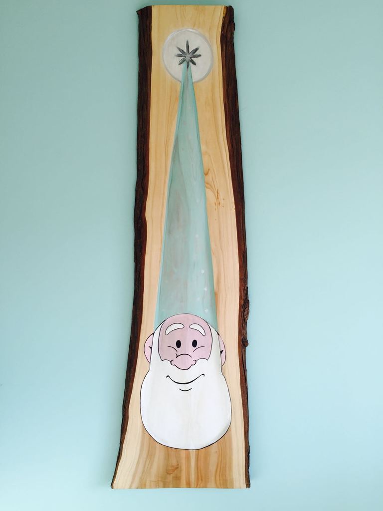 Voor de geboorte van Yentl is deze kabouter/slaapman gemaakt op een houten paneel, waaraan de schors is blijven zitten. Een relief in hout waardoor het lijkt alsof de kabouter naar je toe komt. Het paneel heeft de kleuren van de slaapkamer van Yentl.