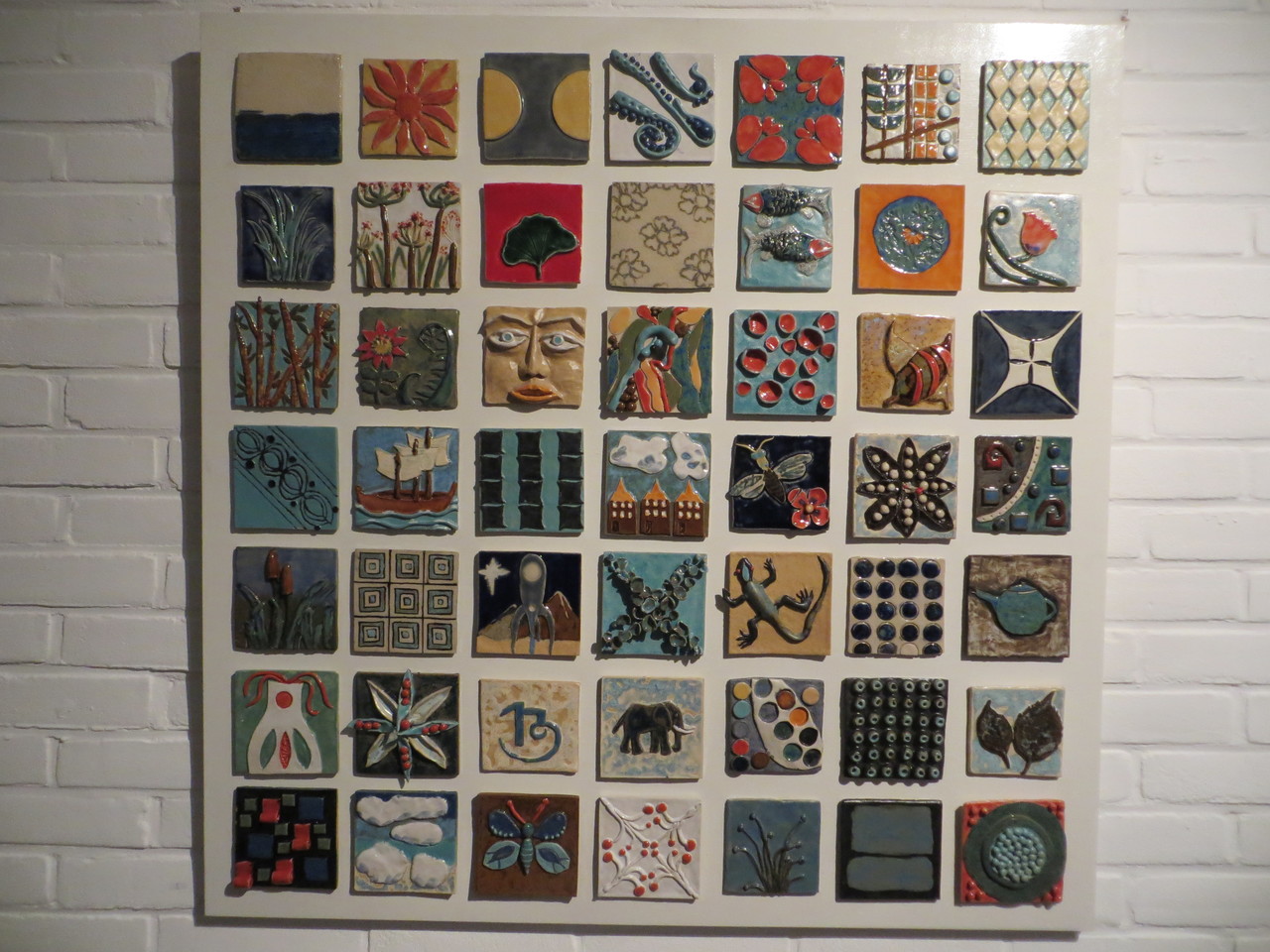 Groot tegeltableau met negenveertig tegels. Allemaal anders.