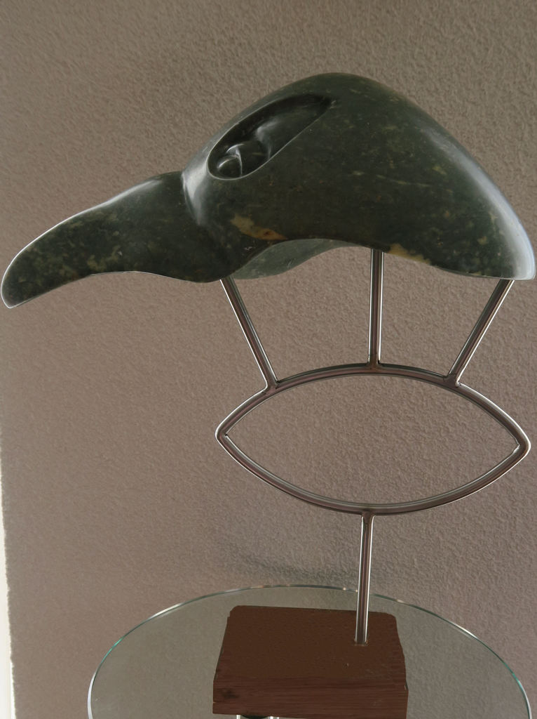 Vogel is van serpentijn gecombineerd met roestvrij staal Totale hoogte is 40 cm incl. voet van hout