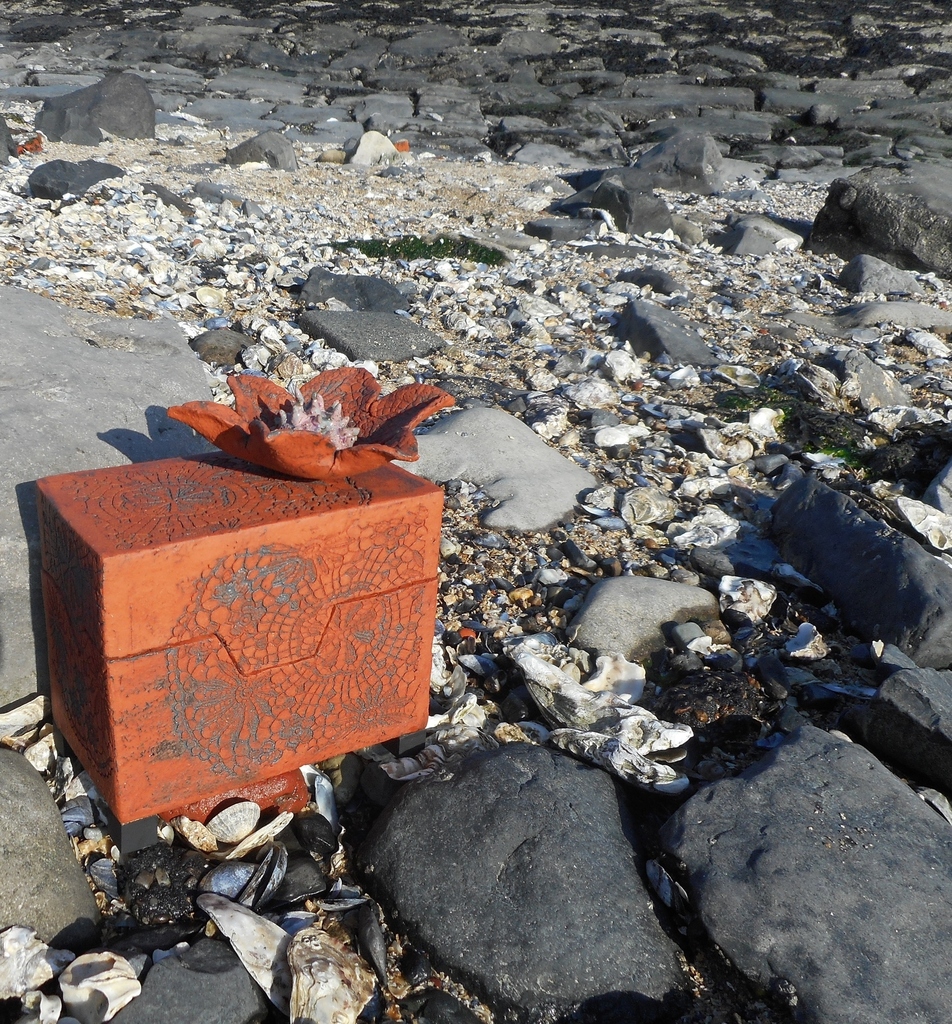 Urn met lotusbloem....handvorm....rode klei met oxyden en glazuur.