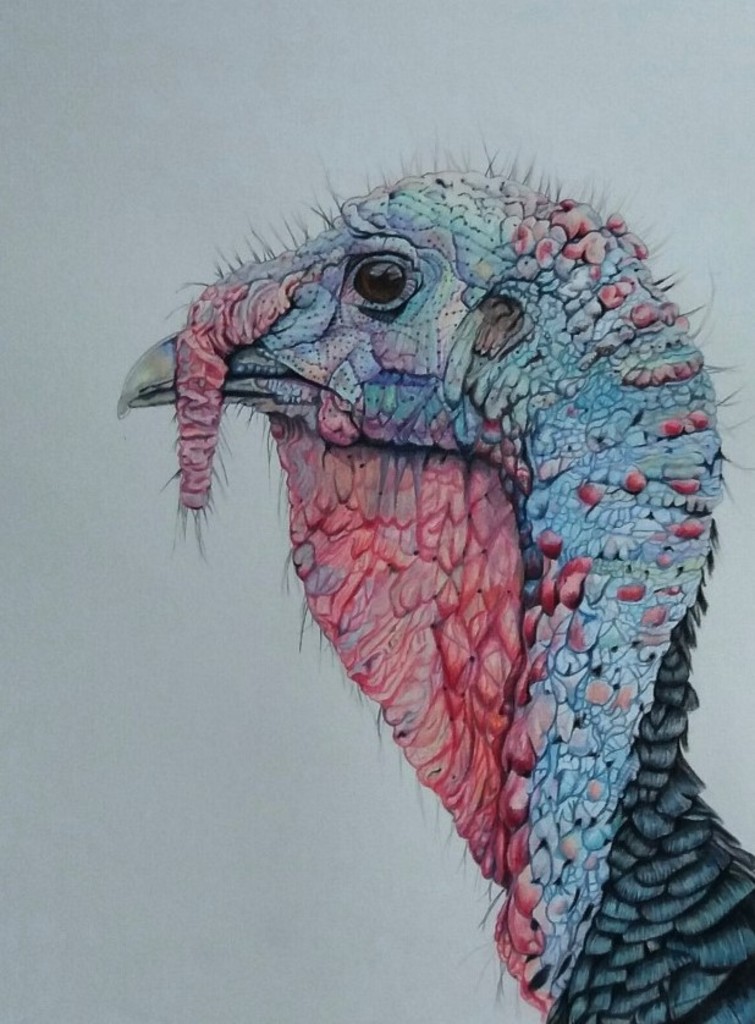 Tekening van een kalkoen. Gemaakt met kleurpotloden op zwaar tekenpapier.