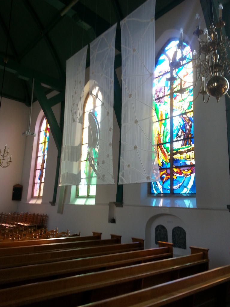 3 Chiffon zijde wandkleden met handgevilt merinowol voorstelling van radiotelescoop. Hier in de Grote of Johanniskerk te Lekkerkerk bij de manifestatie 'Feest van de Geest' mei 2016. RTV Krimpenerwaard heeft een televisiereportage in de kerk gemaakt.