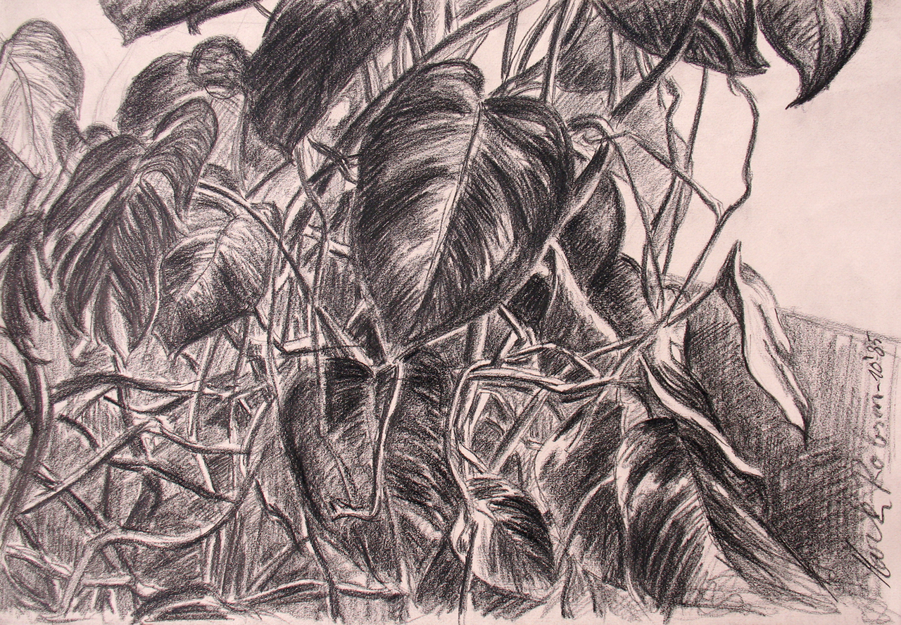 Studie van het gebladerte van een weelderige plant in de woonkamer. - Pastelpotlood op Cansonpapier.