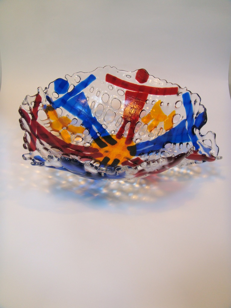 Ronde glasschaal opengewerkt met man, vrouw, kind en hond figuren. Bullseyeglass.