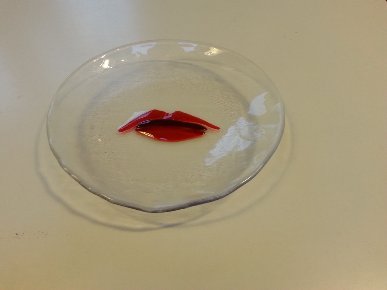 Rond helder glasbord met rode mond in reliëf, Bullseyeglass fullfusion.