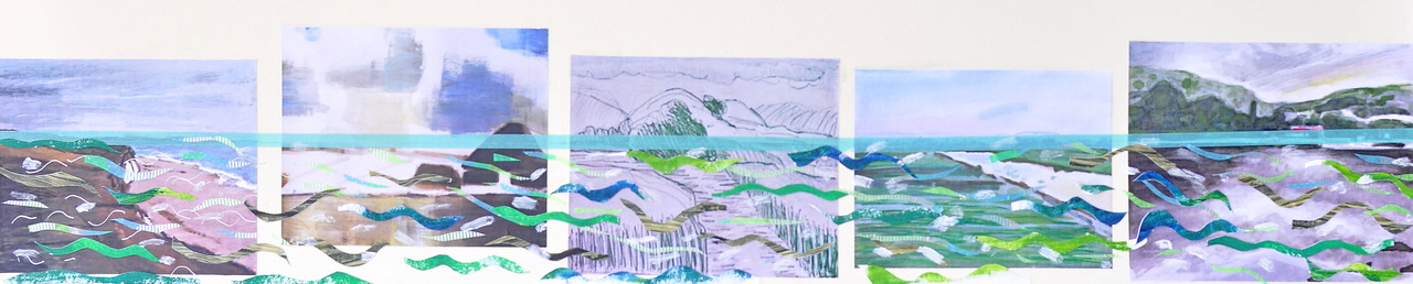 Dit werk is ontstaan door het opplakken van prints die gemaakt zijn van bestaande werken van mijzelf, met de horizon op een lijn geplaatst. Daaroverheen heb ik kleine strookjes papier geplakt, die water moeten suggereren. Het geheel is in een aluminium lijst geplaatst.