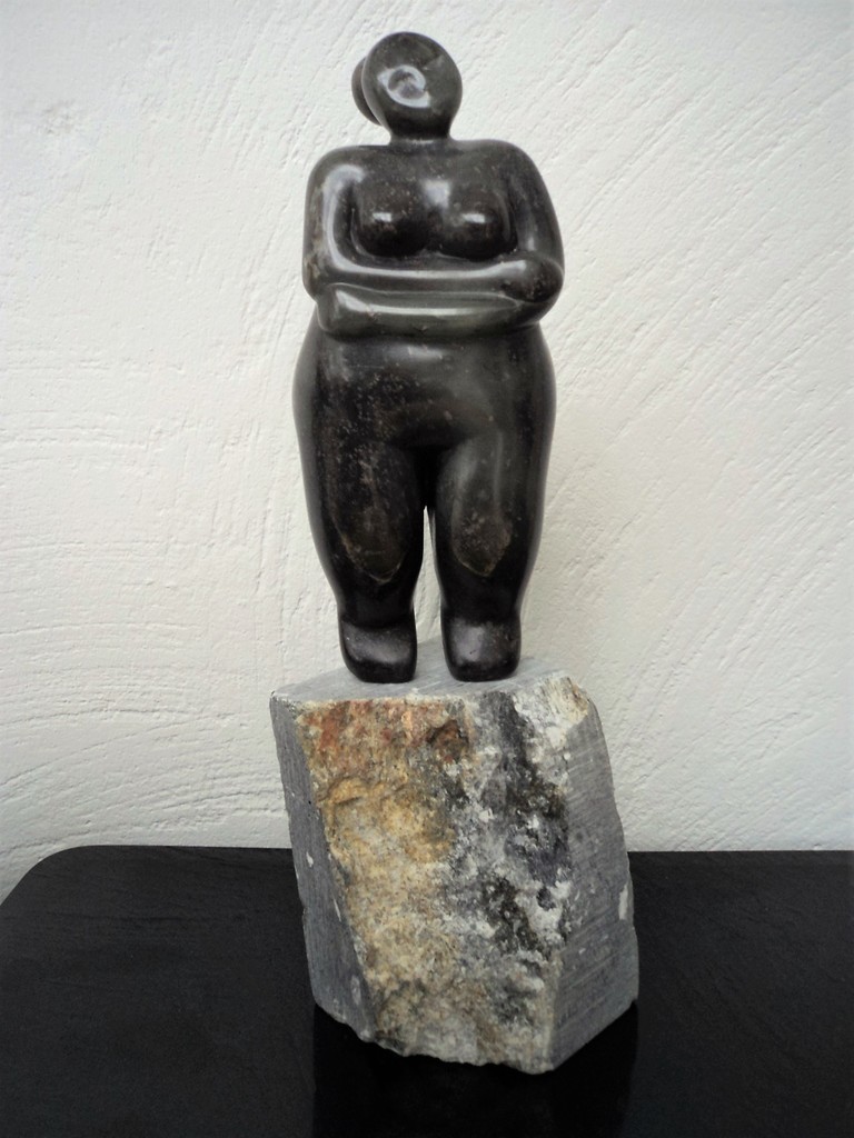 dit stoere dikkerdje is gemaakt van speksteen en staat op een ruwe sokkel. Verkocht.