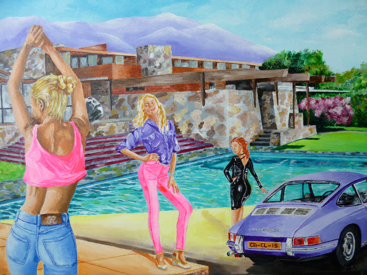 Schilderij voorstellende 3 vrouwelijke modellen tegen een achtergrond waar een woning van Frank Lloyd Wright te zien is. Verder speelt een klassieke Porsche 911 uit 1970 een hoofdrol.
