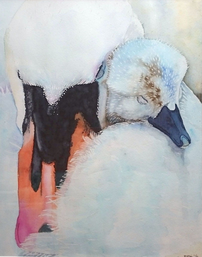 Lieflijk tafereel van een moederzwaan met kuiken (inclusief essenhouten lijst en passe-partout).