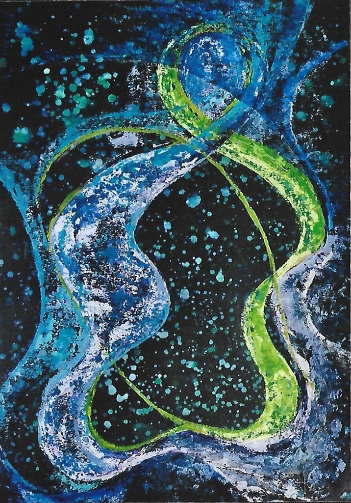 Schilderen met acryl en paletmes. Meeste schilderijen ontstaan vanuit innerlijk beeld, indruk of tekst.