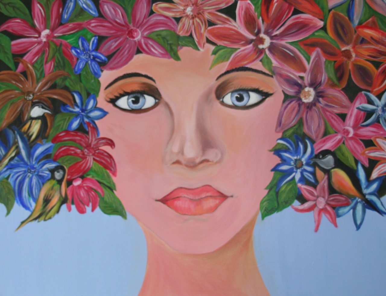Gezicht van een vrouw met bloemen en vogels