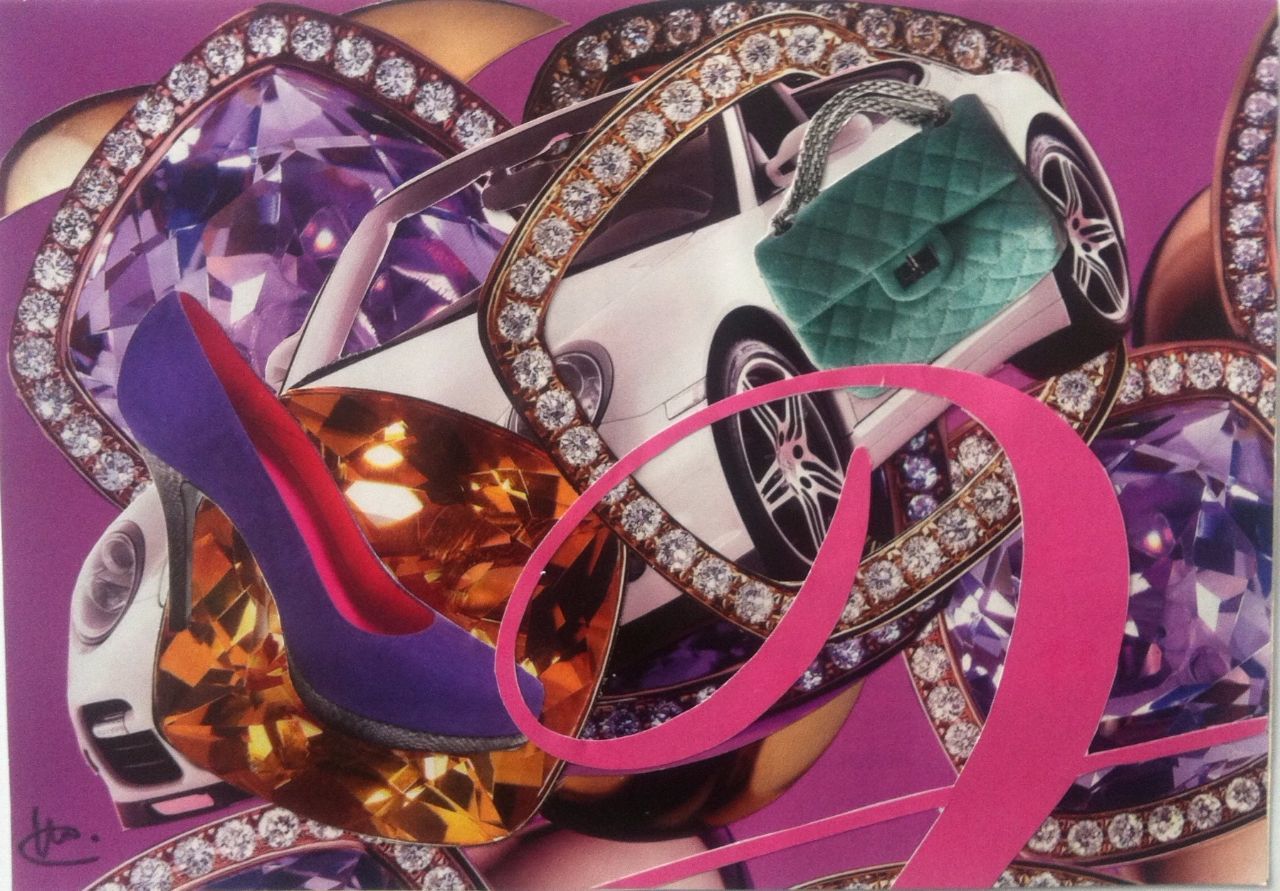 Ik maak papieren collages. Hiervoor gebruik ik tijdschriften, bij voorkeur de meer glossy uitgaven. Ik volg mijn intuïtie en gebruik mijn verstand bij het oplossen van 'problemen' in de verbinding van de papieren onderdelen.