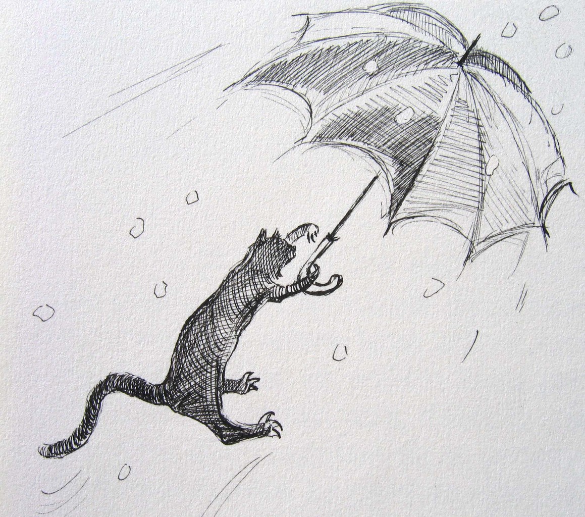 De wind tilt de kat Eveline op, die een paraplu vasthoudt, het komt gelukkig wel goed.