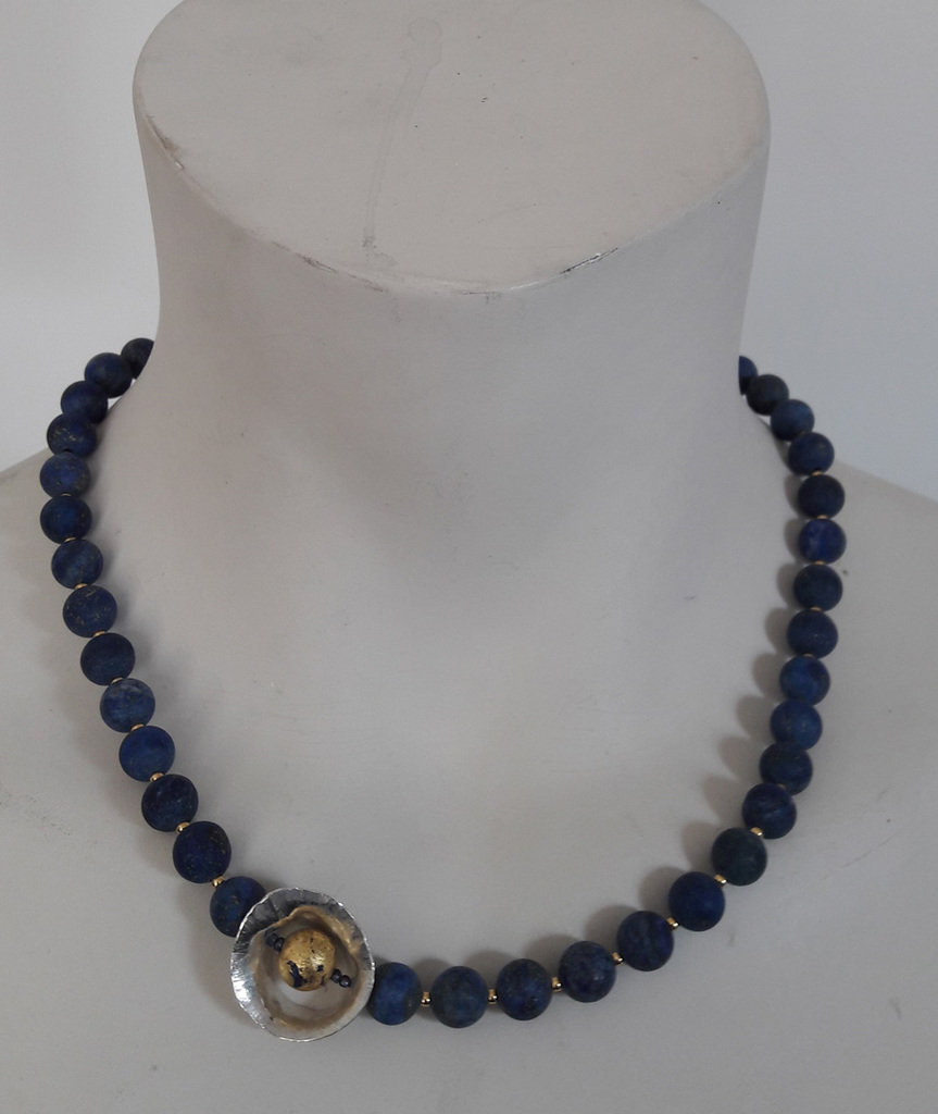 Blauwe lapis ronde kralen, met een zilveren object, met daarin een kraal met bladgoud.
