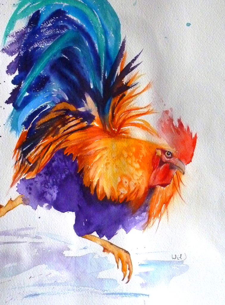 Geel Blauw Paars Groen Aquarel Kip Haan