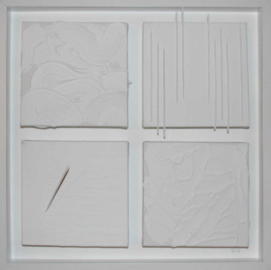 Mixed media op 4 doeken van 20 bij 20cm. Samen in een witte lijst. De drooglegging en ontwikkeling van Haarlemmermeer in 4 fasen. Van zee naar moeras; van boerenland met sloten en wegen tot stedelijk gebied met kunst.