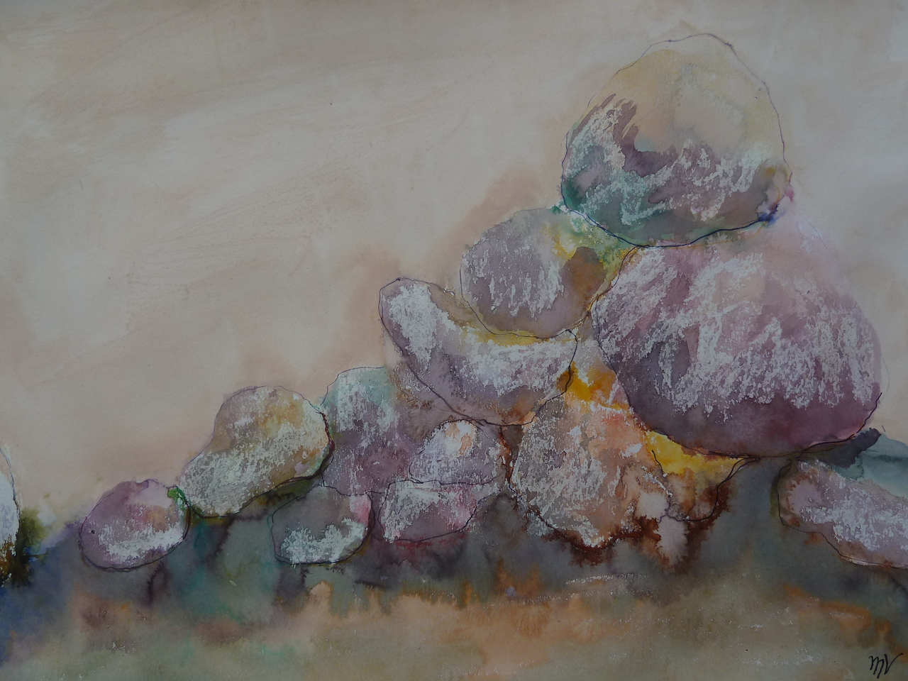 Mijn onderwerpen vind ik zowel in mijzelf als in mijn omgeving. Ik begin te werken vanuit de waarneming en laat deze dan langzamerhand steeds meer los.