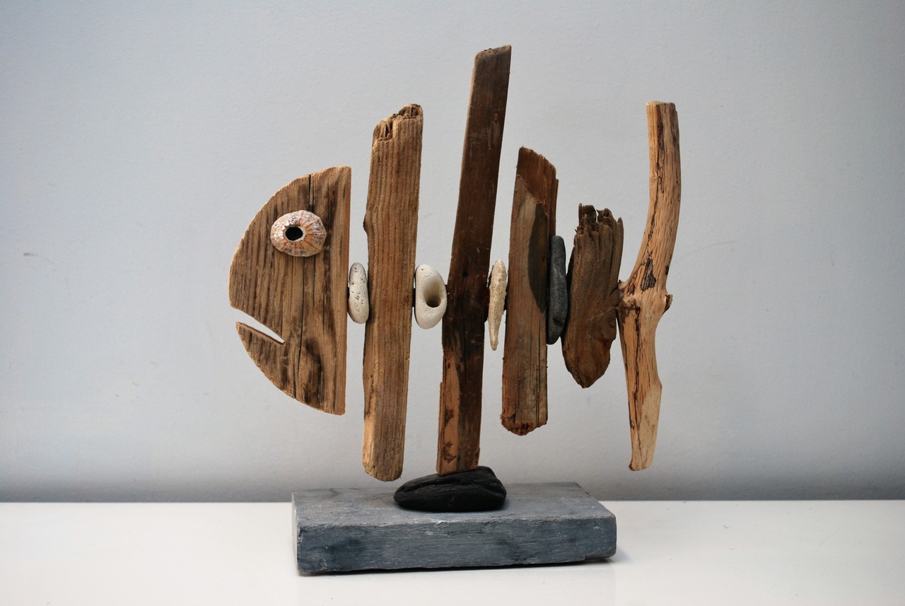 maakt al jaren houten beelden door natuurlijke objecten uit zee te koppelen. De beelden zijn ruw en puur.