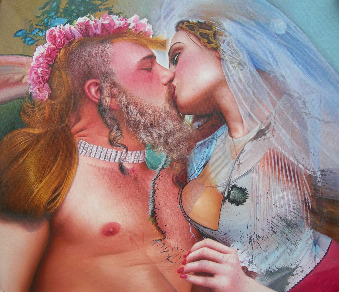 Surreeel God Vrouw Man Realistisch Olieverf Kussen Borsten Schilderij Tieten Surrealisme Realisme Haar Kleur Erotiek Sex Christelijk Geloof Sureëel Bijbel Erotisch Porno Zoenen Siliconen Christen