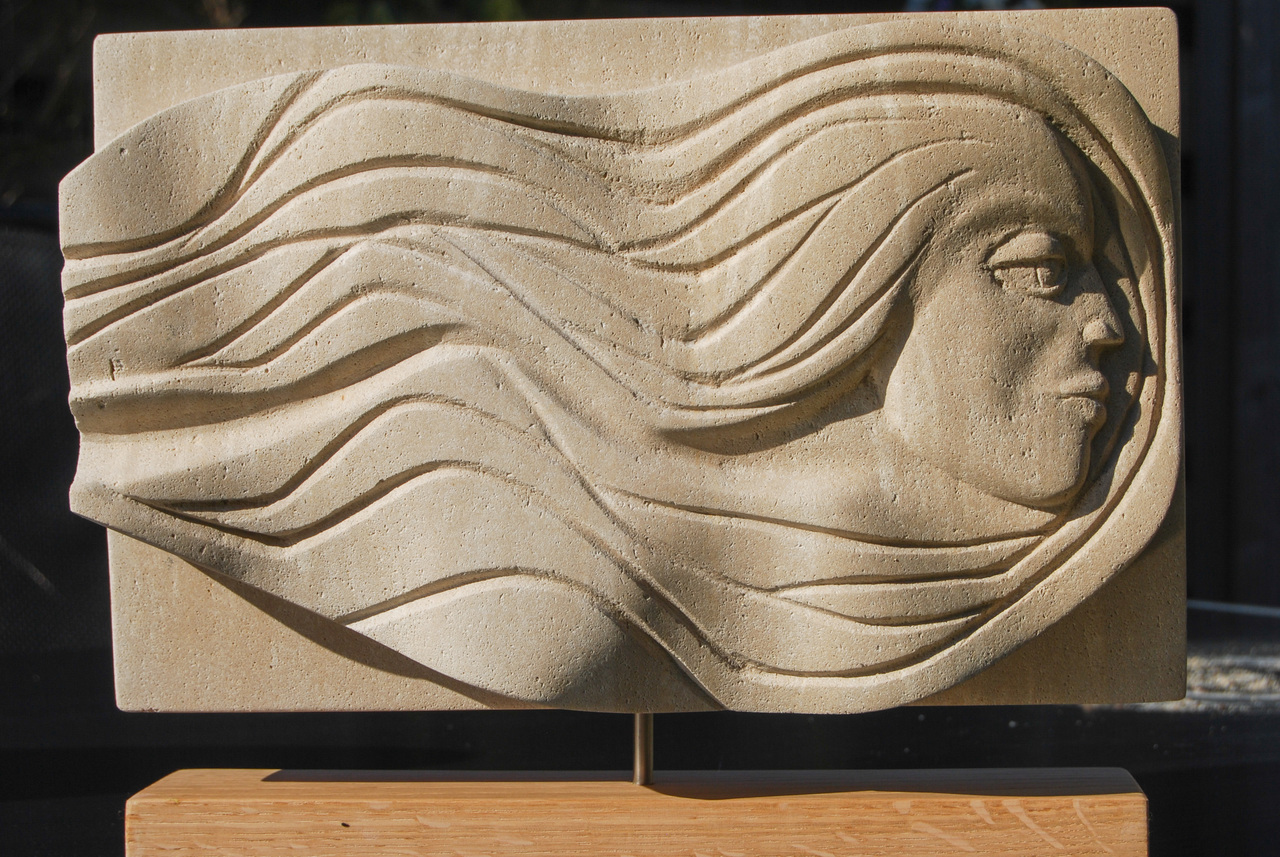 Beeld dat ingebracht kan worden in een gevel. Gemaakt van Fr. kalkzandsteen Savonniere. Eurydice is een waternimf uit de Griekse mythologie