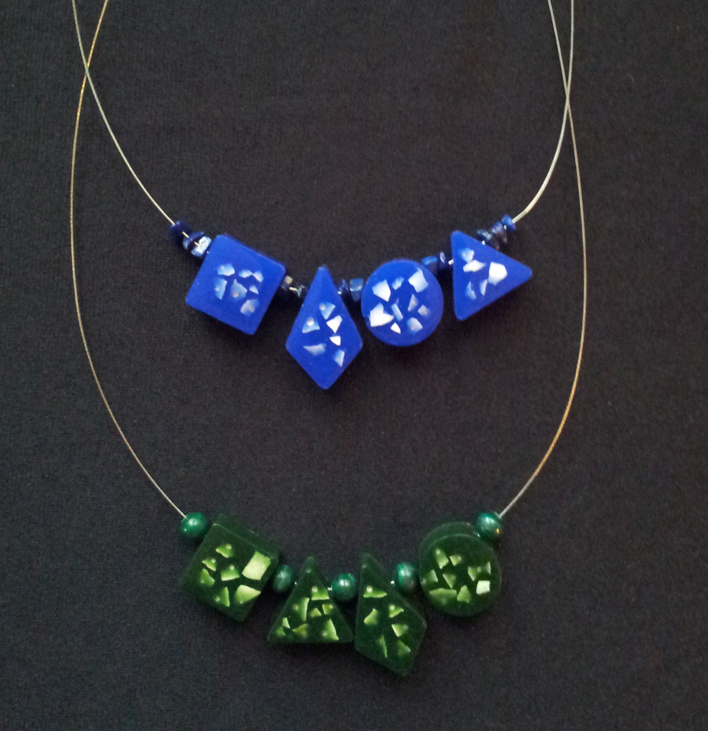 Blauw of groen kunsthars met eierschaal kralen, geometirsch ( rond, vierkant, driehoek en punt), € 30 per stuk