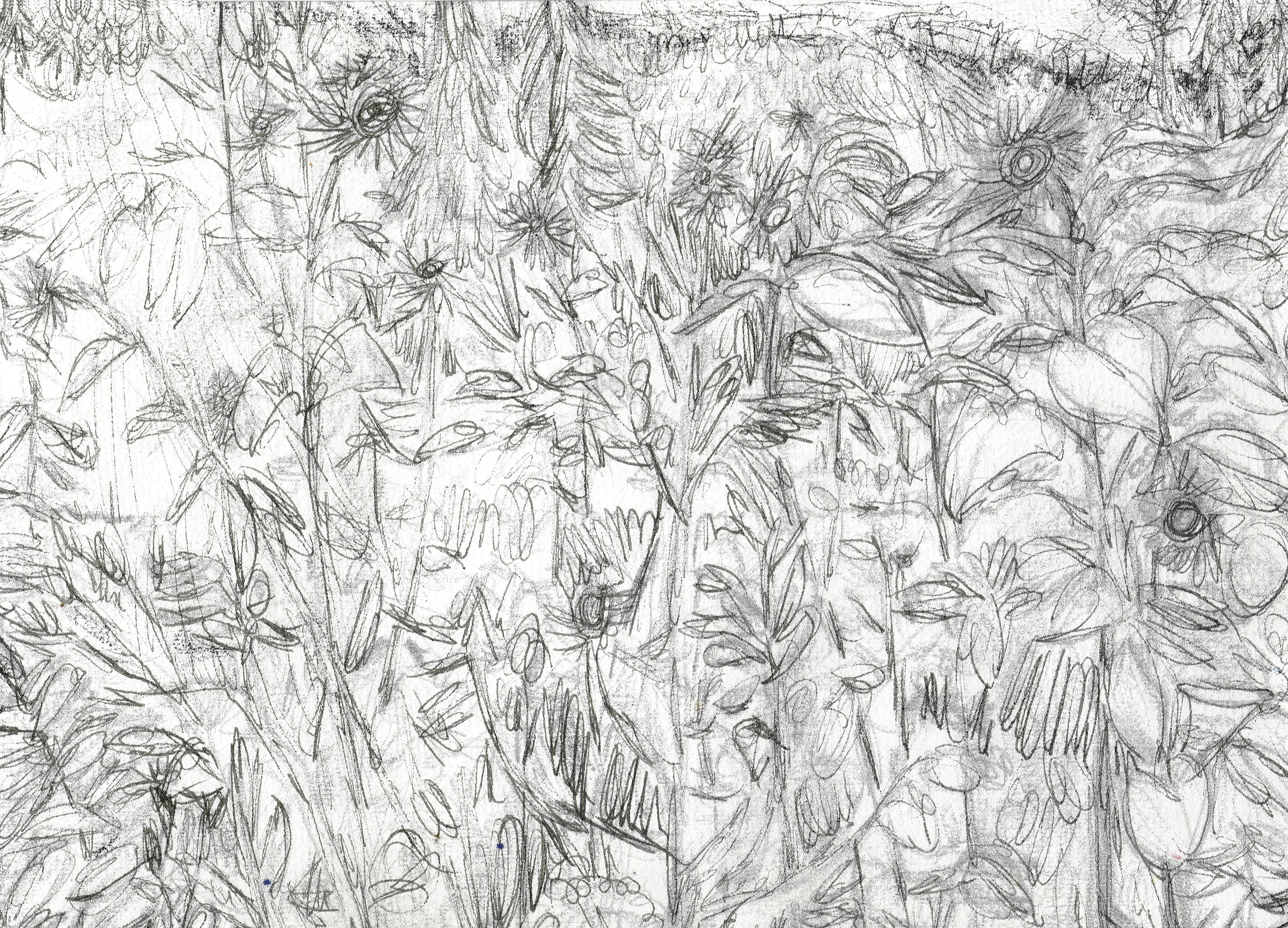 Pen- en potloodtekening van zonnebloemen in het heuvelrijke landschap van Beek-Ubbergen.