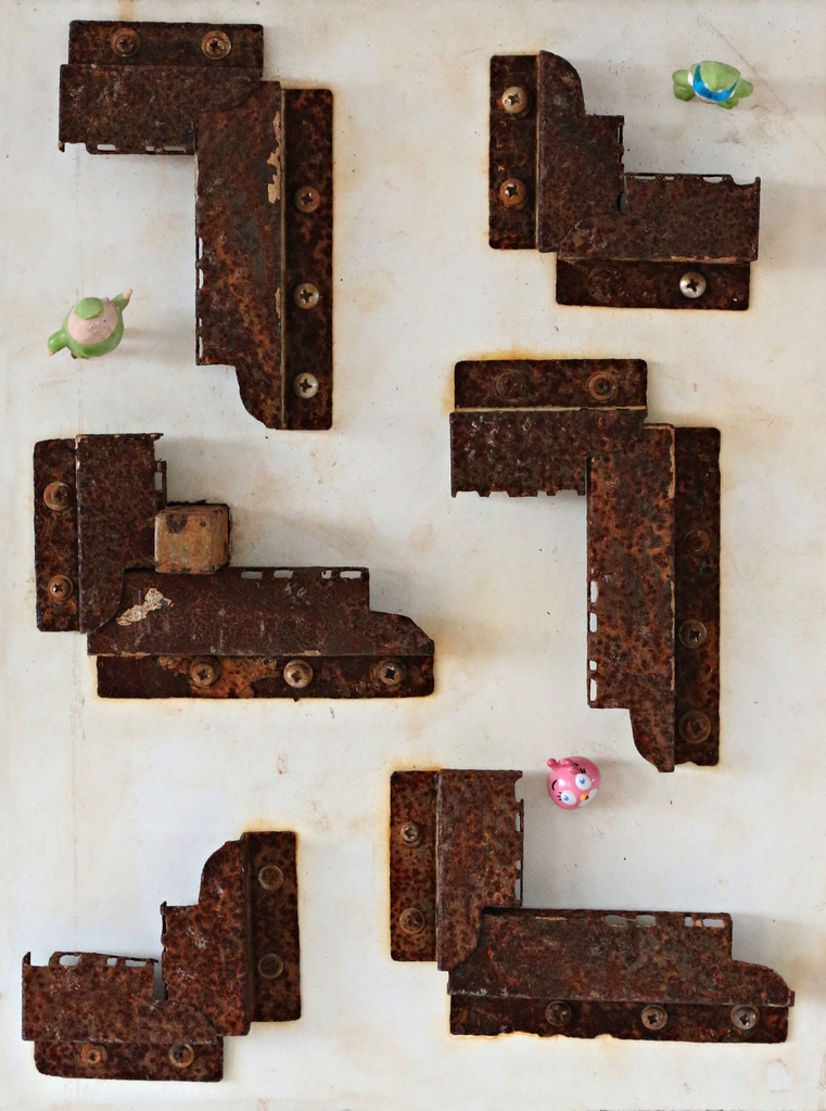 samengesteld uit hout, geroestmetaal en aluminium