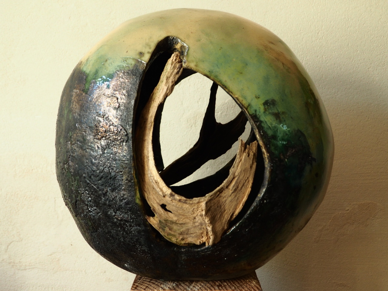 Na de eerste stook is het object behandeld met koperoxyde en glazuur. Na de tweede stook wordt de oxide met een gasbrander gereduceerd tot elementair koper De doorkijk openingen zijn voorzien van een oorspronkelijk deel uit een vergane boom.
