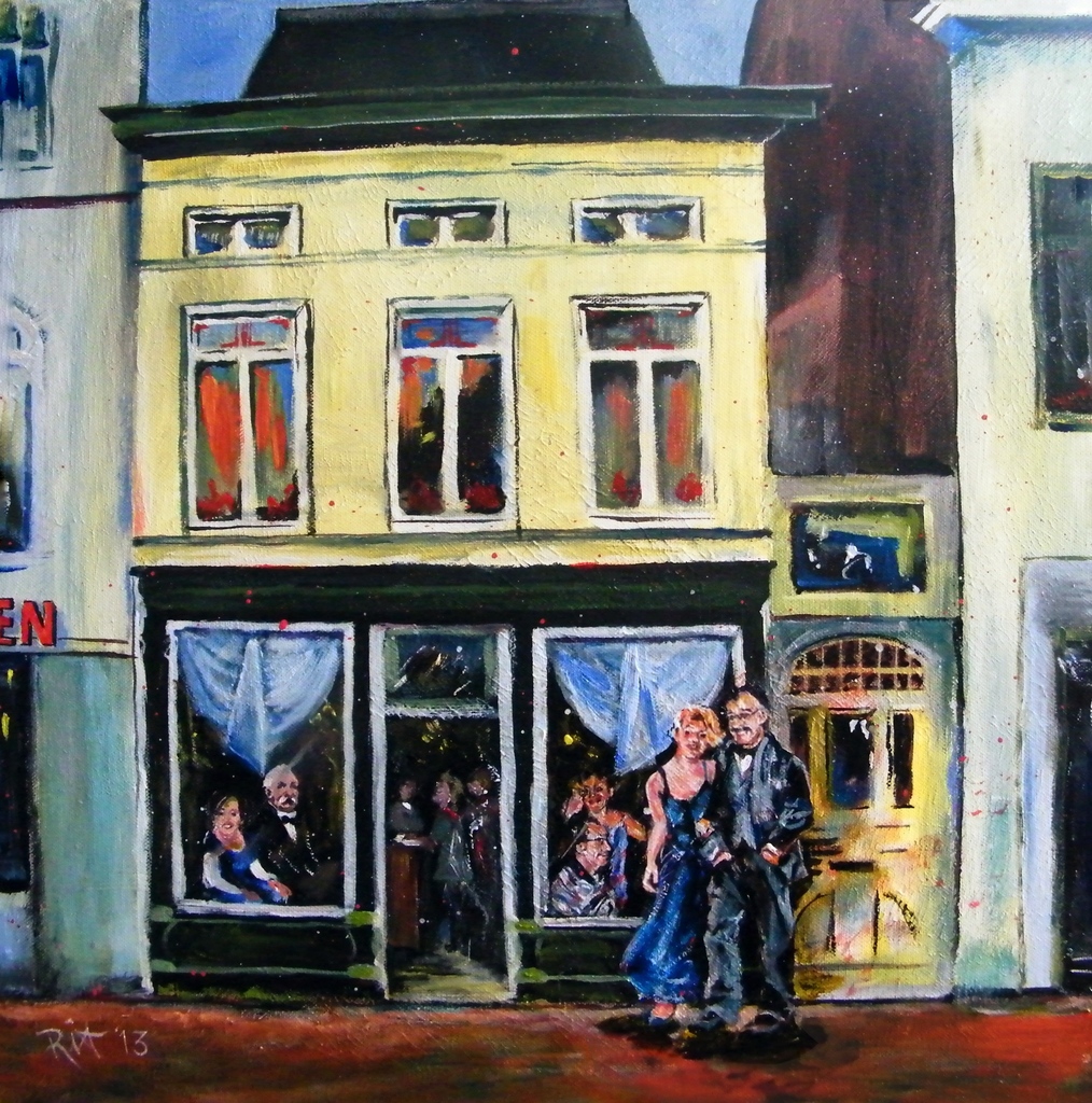 De 3 weesgegroetjes is de naam van een café in Roosendaal. Het was de bijnaam van de 3 oude vrijsters die daar hun hele leven een drogisterij annex fotografie hadden tot in de jaren 60 van de vorige eeuw. Op het schilderij staan binnen afgebeeld: de vader van de drie dames, de vorige eigenaresse van het café, mijn partner en ikzelf, buiten: de oprichter van café De 3 Weesgegroetjes met zijn vrouw. Het café bestaat nog steeds.