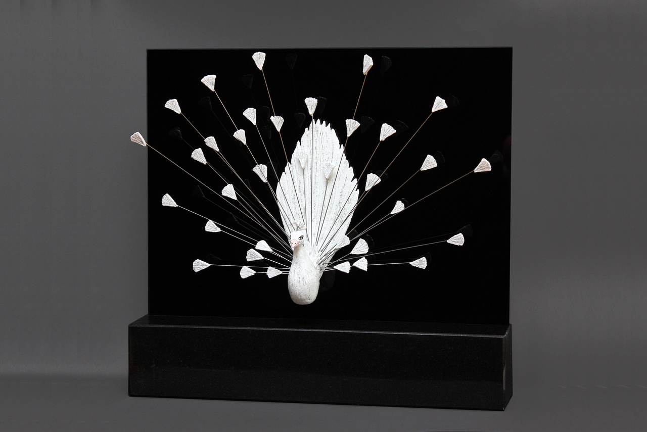 Witte pauw, keramiek op zwart glas, in sokkel van zwart graniet