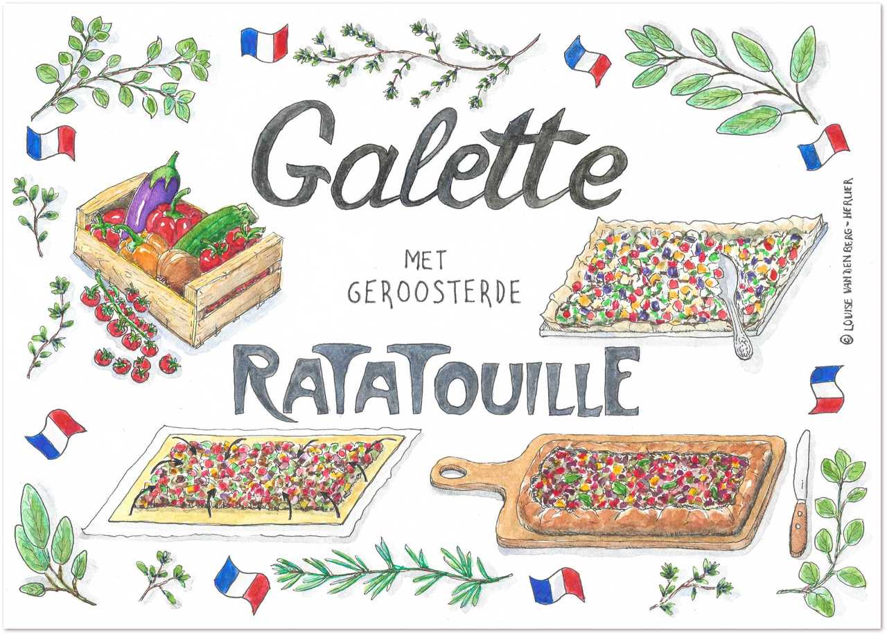 Illustratie in pen en aquarel bij het recept van "Galette met geroosterde ratatouille". In opdracht van Tante Fanny bladerdeeg. Het is ook te zien op mijn kookblog www.keukenatelier.com 15 x 20cm