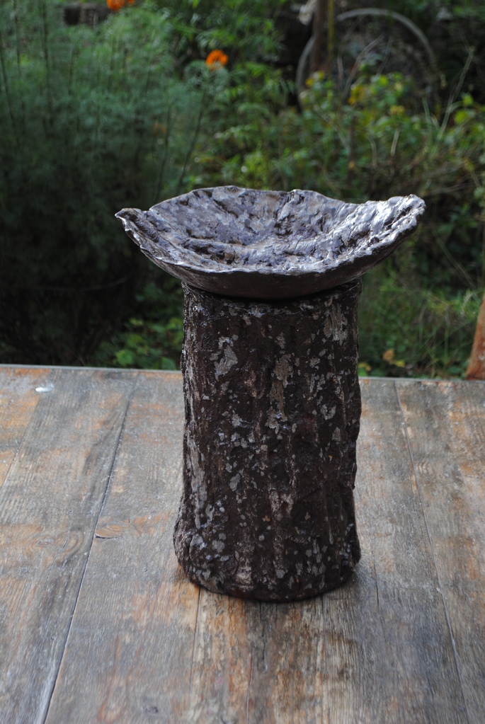 Boomvaas met schaal van aardewerk. Donkere klei met glazuur.