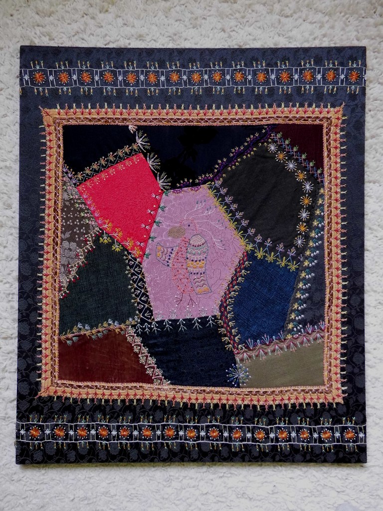 Met veel plezier ontwerp en maak ik mijn crazy quilts, een vorm van patchwork met onregelmatige vormen waarbij de naden bewerkt worden met borduurwerk, eventueel aangevuld met bijvoorbeeld kant, kralen of applicaties.