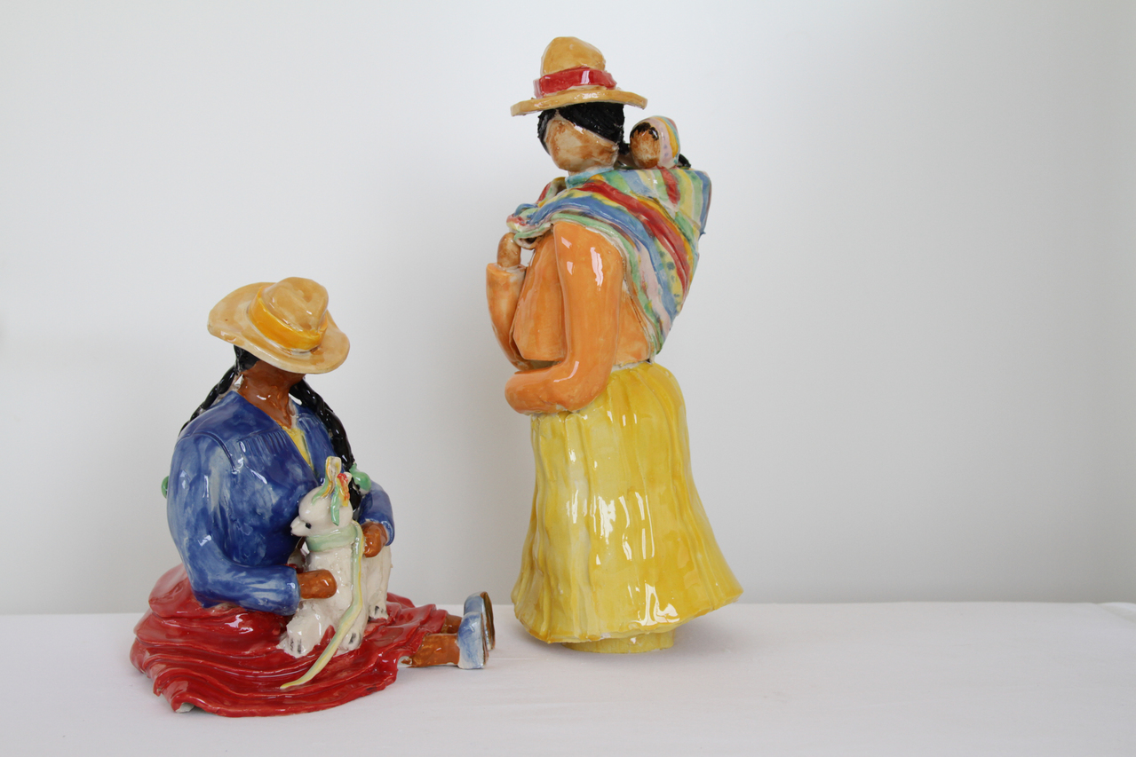Zittende Peruaanse met kleine lama en staande met kind