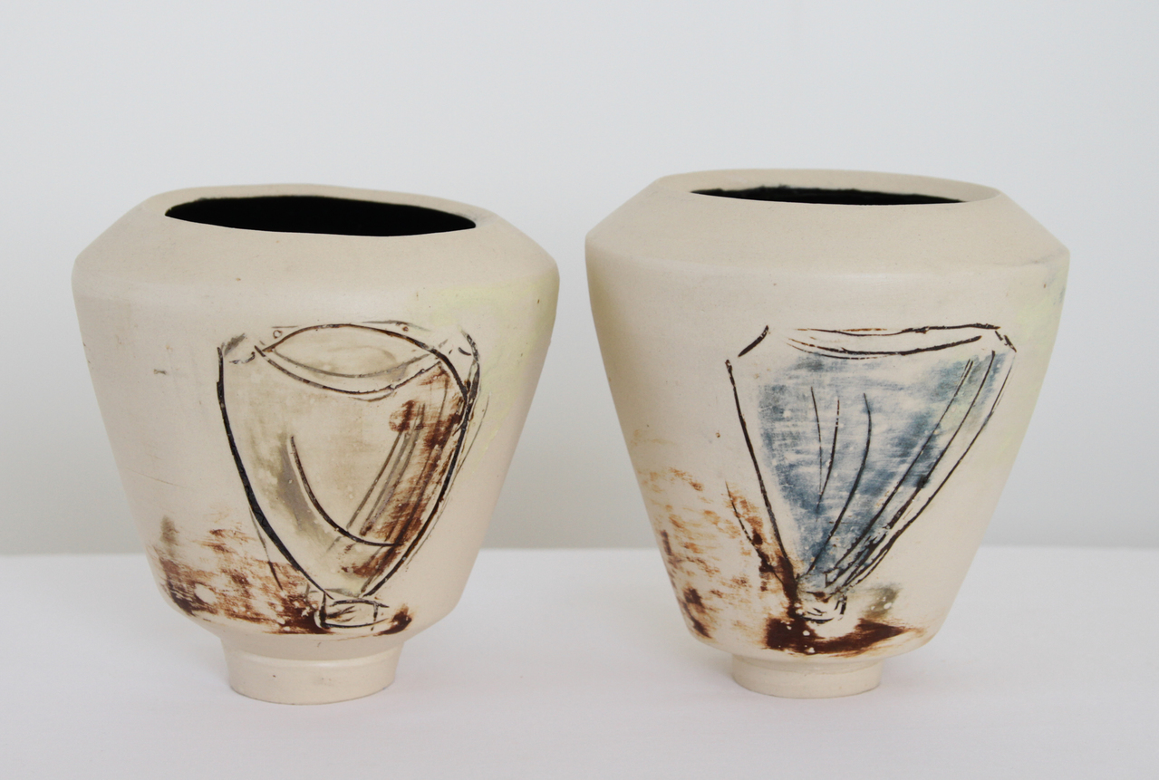 Twee potten met ingekraste schets, bewerkt met engobes en geschuurd voor fresco-achtig effect