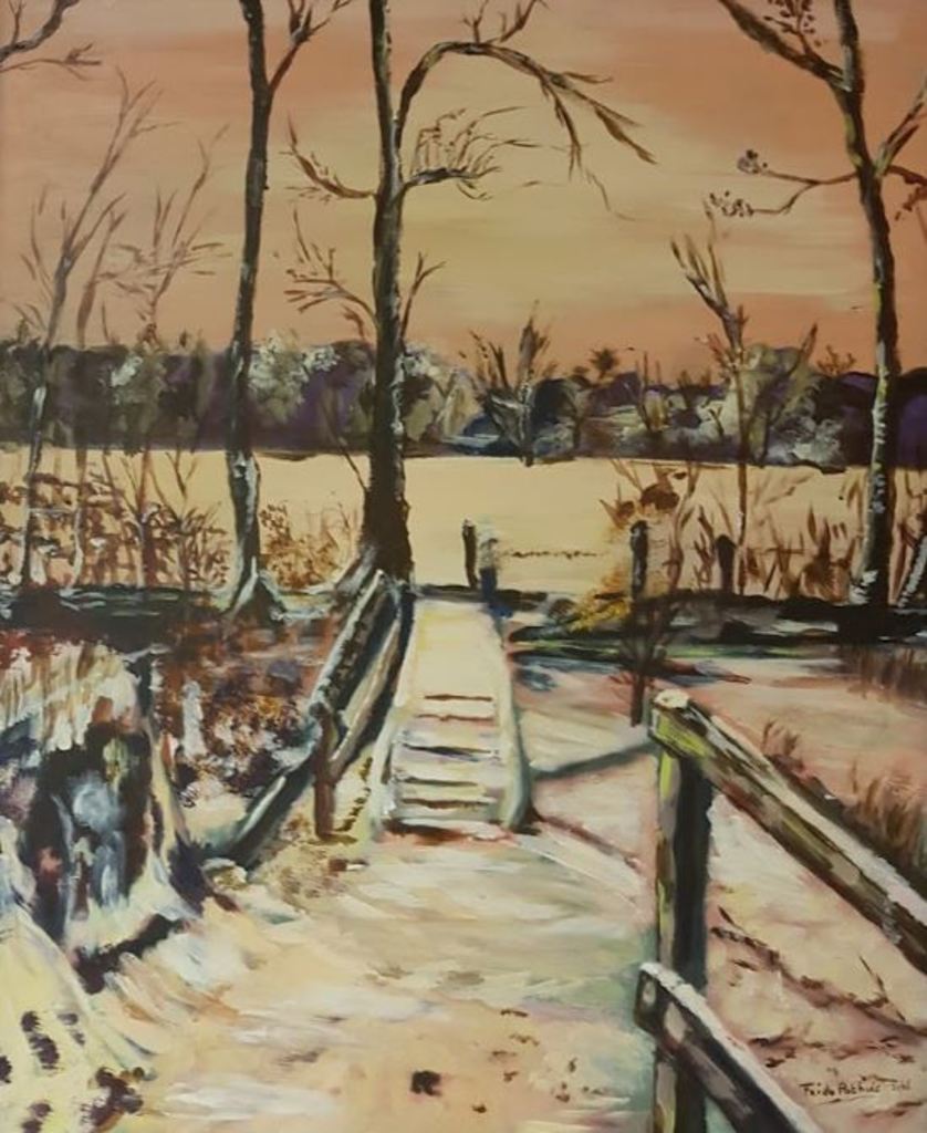 In de avond kleurt zelf de sneeuw mee met het licht. Zelfs sneeuw kan branden. In de schildering in een "Hoogholtje" verwerkt, een verhoogd bruggetje Ingelijst